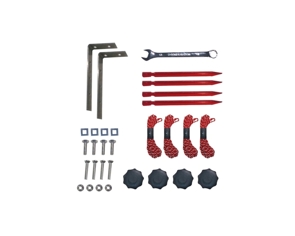 Fácil instalación y desmontaje. Incluye 4 piquetas, 4 vientos y los herrajes de fijación.