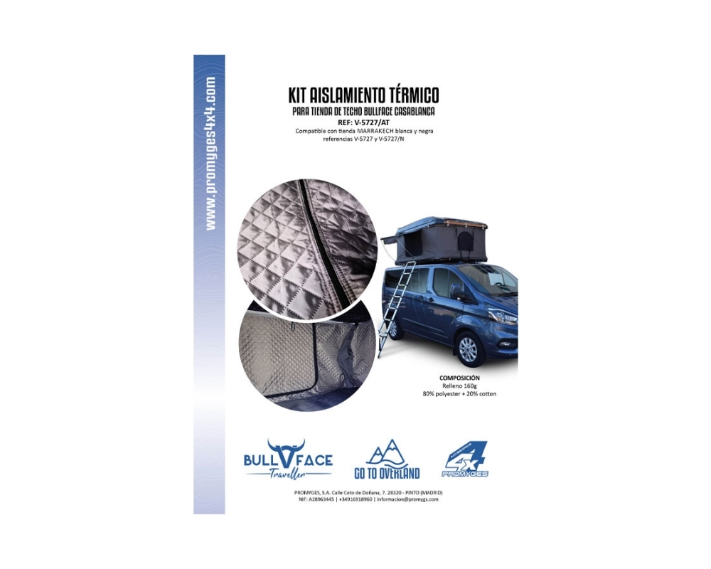 El aislante cubre el perímetro interno de las tiendas Bullface Casablanca evitando que el frío traspase al interior y que el calor salga al exterior. La manta se fija con velcro ya instalado en la tienda y en la propia manta. Puede instalarse en modelos anteriores (sin velcro instalado en interior de tienda), pero requiere adaptación por parte del cliente.