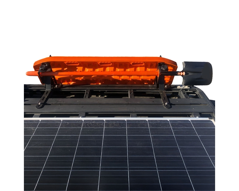 El soporte permite transportar de forma segura 4 MAXTRAX MKII, 4 MAXTRAX XTREME o un par de cada uno, además de una pala de mango largo.