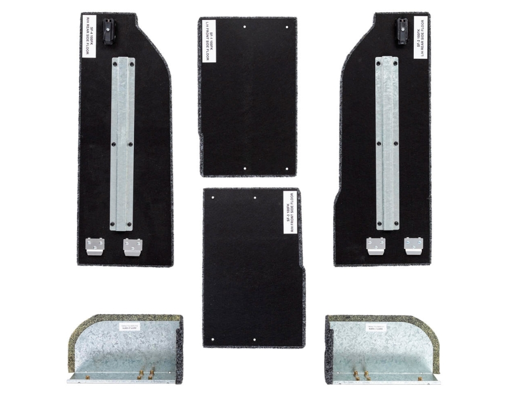 Cada kit de piso lateral contiene pisos laterales izquierdo y derecho. Las pestañas de bloqueo de acero inoxidable ubican y retienen un extremo de la sección de piso removible, mientras que el otro extremo se fija con un pestillo de presión para cerrar fácil de usar. Una sola palanca desacopla el pestillo para quitar el piso. La combinación de pestañas de acero inoxidable y un pestillo sencillo y directo da como resultado un área de almacenamiento muy fácil de usar y segura.