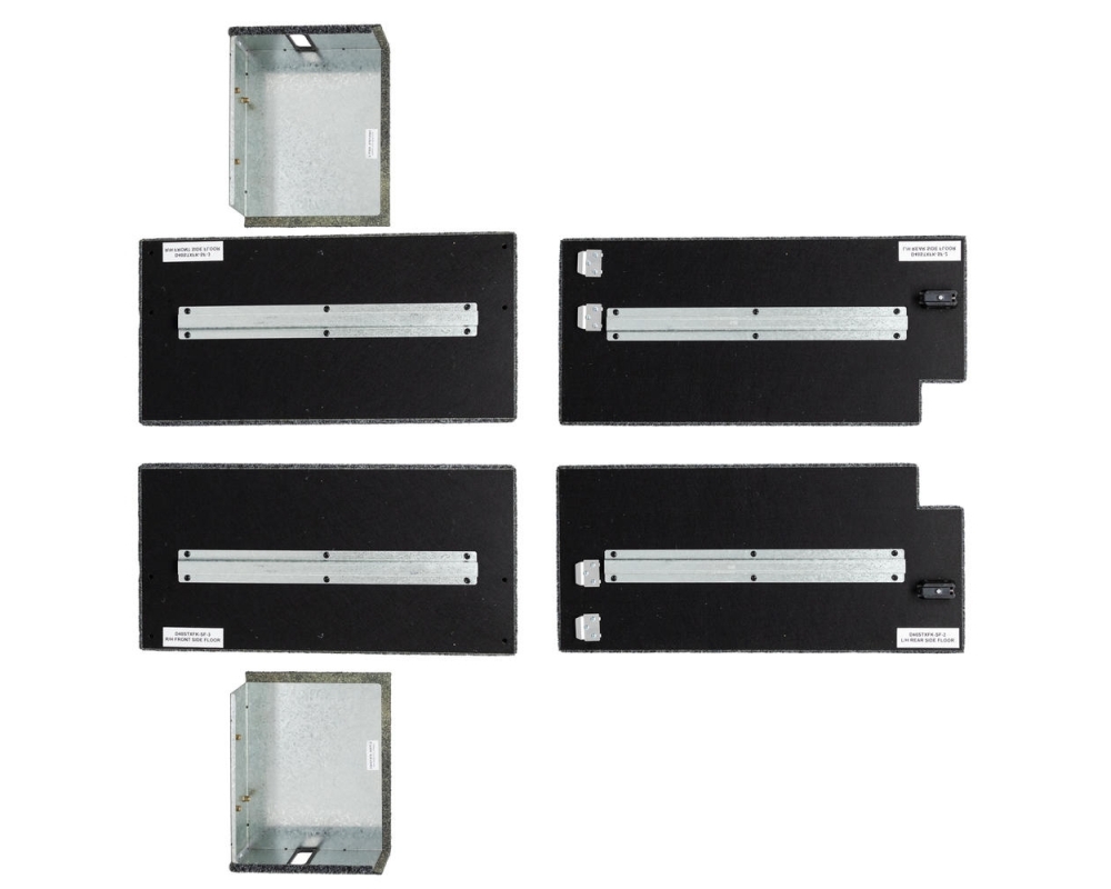 Cada kit de panel lateral contiene pisos laterales izquierdo y derecho. Las pestañas de bloqueo de acero inoxidable ubican y retienen un extremo de la sección de piso removible, mientras que el otro extremo se fija con un pestillo de presión para cerrar fácil de usar. Una sola palanca desacopla el pestillo para quitar el piso. La combinación de pestañas de acero inoxidable y un pestillo sencillo y directo da como resultado un área de almacenamiento muy fácil de usar y segura.