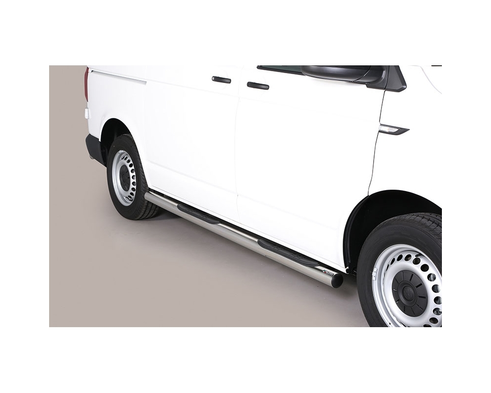 ESTRIBOS EN TUBO INOX Ø76MM, CON PISANTES PARA VOLKSWAGEN TRANSPORTER T6 2015-2024 (SWB CARROCERÍA CORTA)