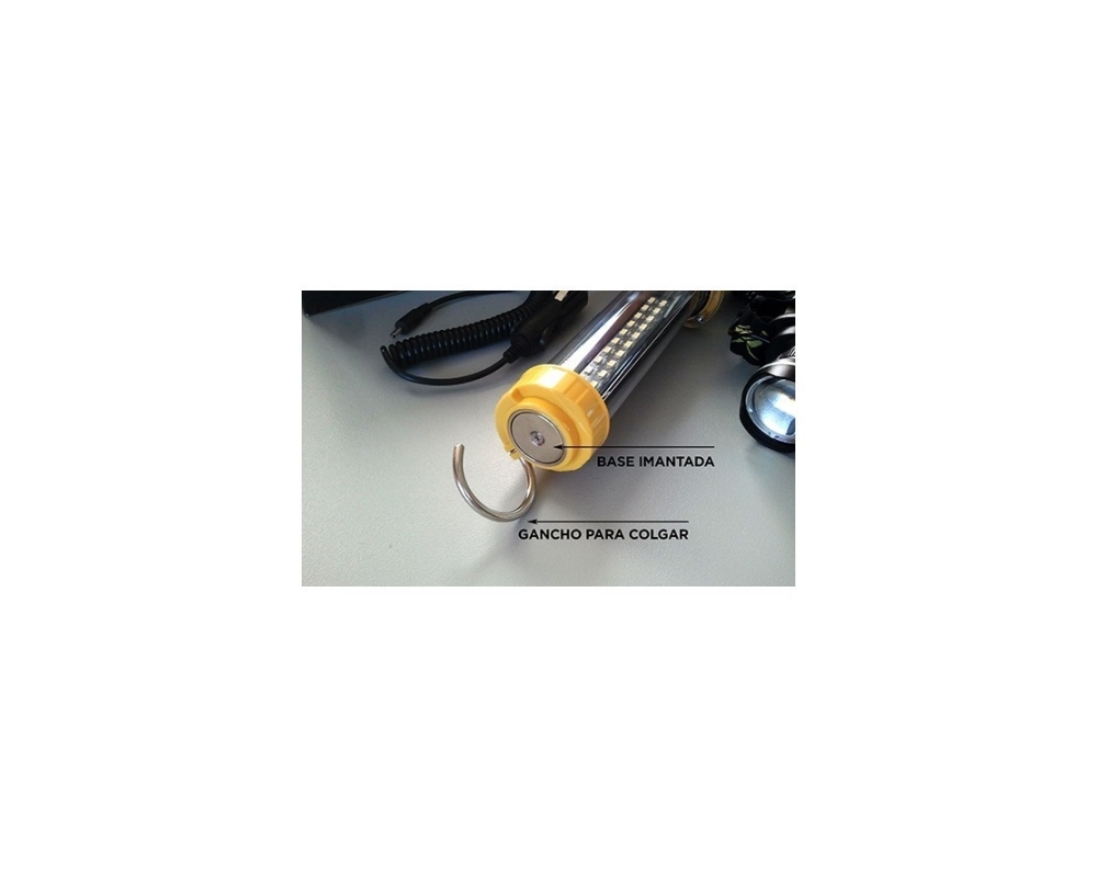 - Viene con gancho para colgar y dos bases imantadas para fijar en la chapa del coche, una en la base y otra en el mango, junto al interruptor.