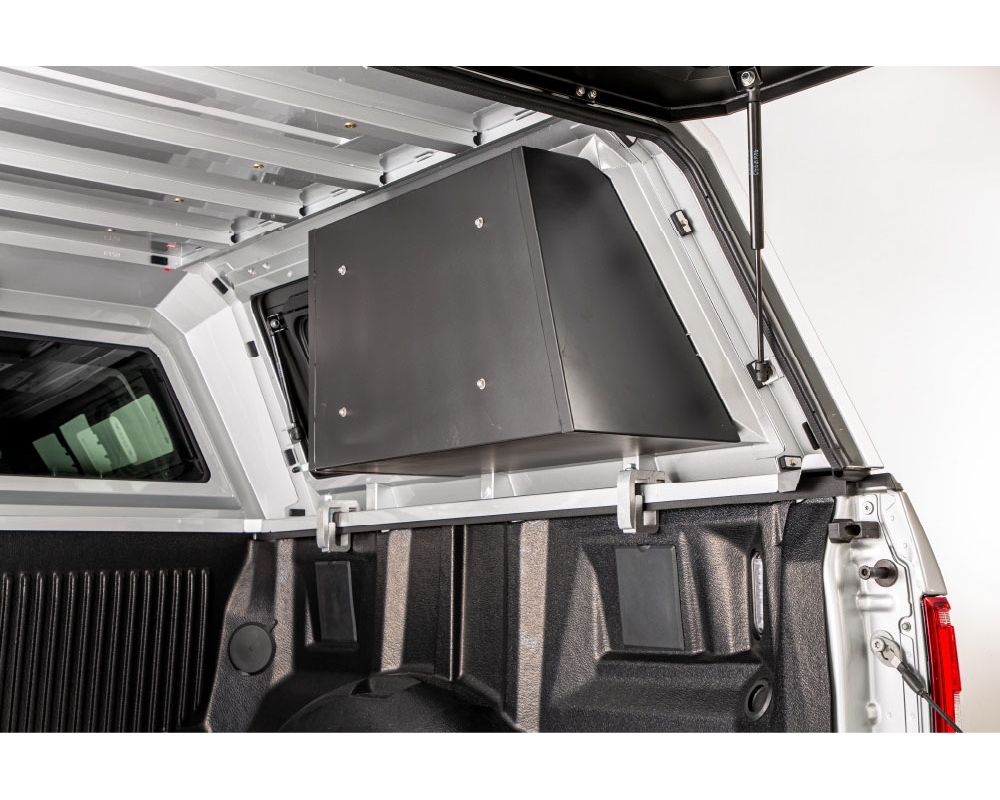 Espacio de almacenamiento comunicado con el cajón de la pick-up. Permite seguir teniendo acceso a desde el portón lateral, y al mismo tiempo, tener acceso a un área de almacenamiento. Cuenta con un panel Molle para una mejor organización