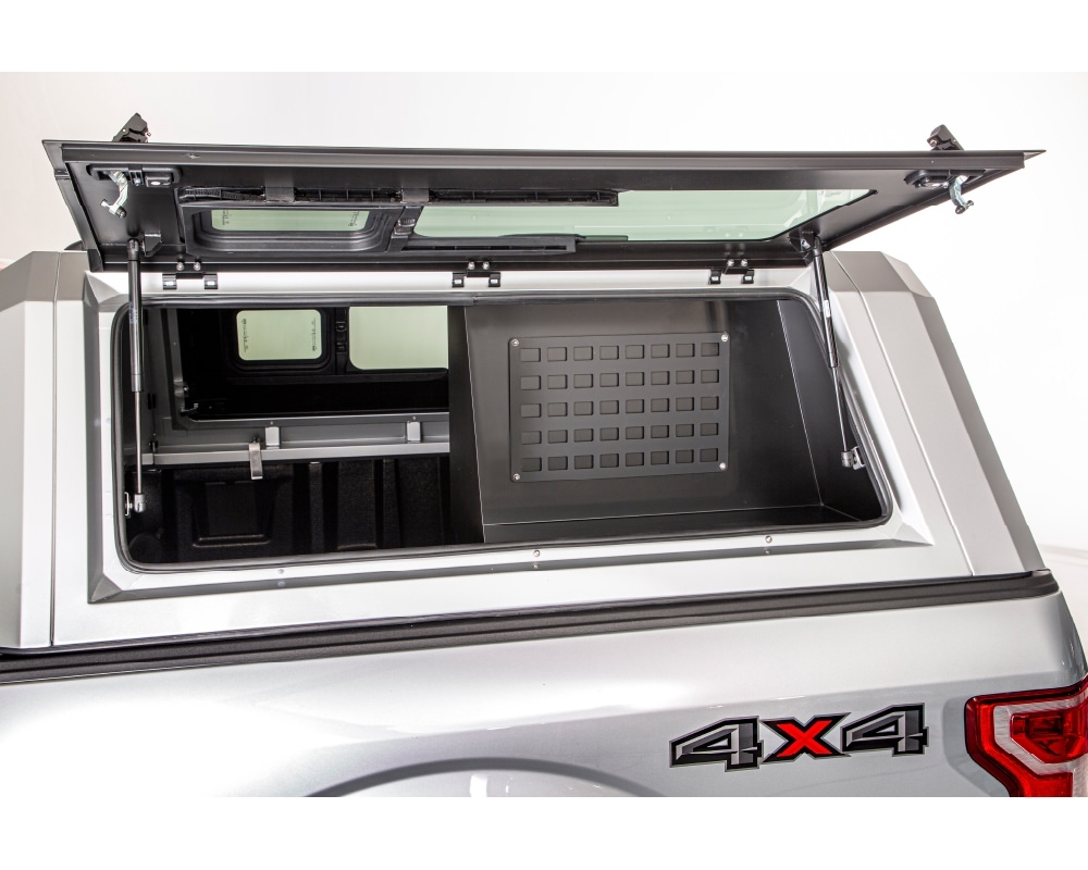 Espacio de almacenamiento comunicado con el cajón de la pick-up. Permite seguir teniendo acceso a desde el portón lateral, y al mismo tiempo, tener acceso a un área de almacenamiento. Cuenta con un panel Molle para una mejor organización