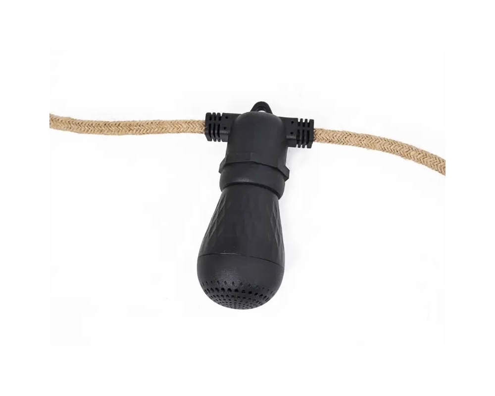 Está compuesta por 8 bombillas y 2 altavoces intercambiables entre sí. Puedes alternar su orden e intercalar bombillas y altavoz cambiándolo de unos casquillos a otros. Los altavoces se conectan mediante Blueetooth a cualquier teléfono móvil o dispositivo. Se puede conectar tanto a 12V como a 220V (adaptador no incluido), lo que la hace versátil para usarla en una furgoneta, en el salón de casa o en cualquier fiesta o evento.