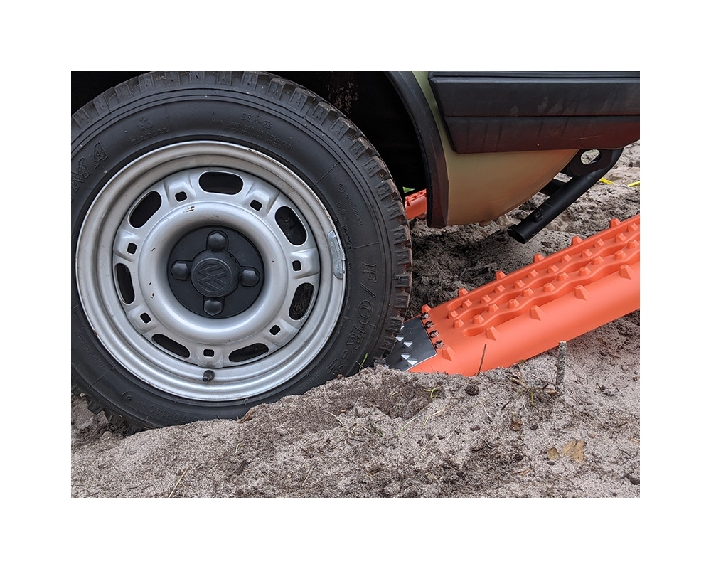 Gracias a la puntera de tracción metálica los tacos no se desgastan cuando la rueda gira y su capacidad de traccion se mantendrá siempre intacta. Esa es la parte más importante, la puntera, con la que ganamos el primer impulso para salir del atasco. Además, llevan una correa de localización para no volver a perder las planchas enterradas después de un rescate.
