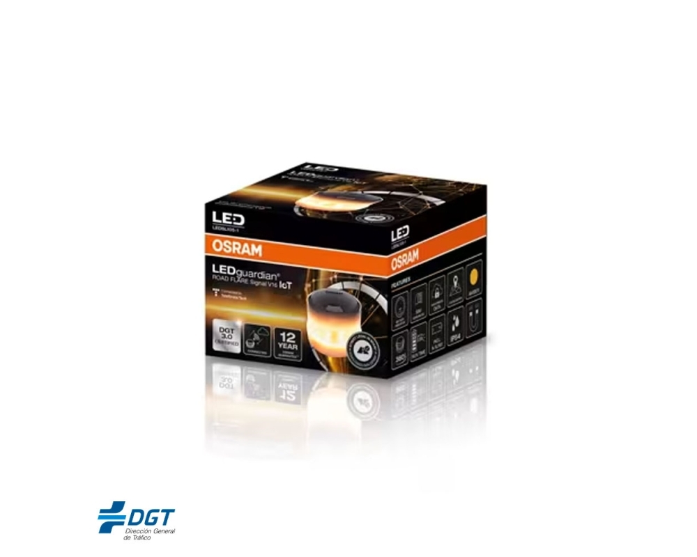 La luz de advertencia LEDguardian ROAD FLARE Signal V16 IoT de OSRAM es la nueva generación de señalización V16: homologada según la normativa DGT 3.0 / V16 / CE, incorpora tarjeta SIM integrada para transmitir de forma anónima la posición del vehículo a la plataforma DGT 3.0 y así avisar a otros conductores y paneles informativos sin que el conductor tenga que bajar del vehículo. Esto la convierte en una solución práctica y, desde 1 de enero de 2026, obligatoria en España como sustituta del triángulo.