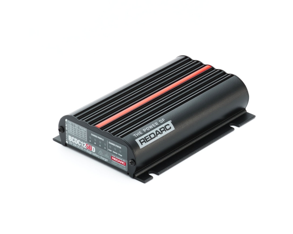 Su estilo, con una línea roja que recorre su espalda, le indica que hay algo diferente en este cargador de baterías dual. Una salida de carga de 50 amperios lo convierte en el más potente de la gama BCDC de REDARC.
