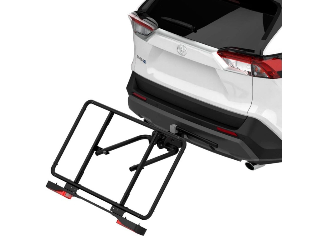 La plataforma cuenta con un sistema de fijación por palanca, que facilita una instalación rápida y segura en la mayoría de bolas de remolque. Su función abatible permite acceder fácilmente al maletero sin necesidad de desmontarla. Incorpora faros traseros con todas las funciones necesarias y sistema antirrobo integrado de serie, que asegura la plataforma al vehículo.