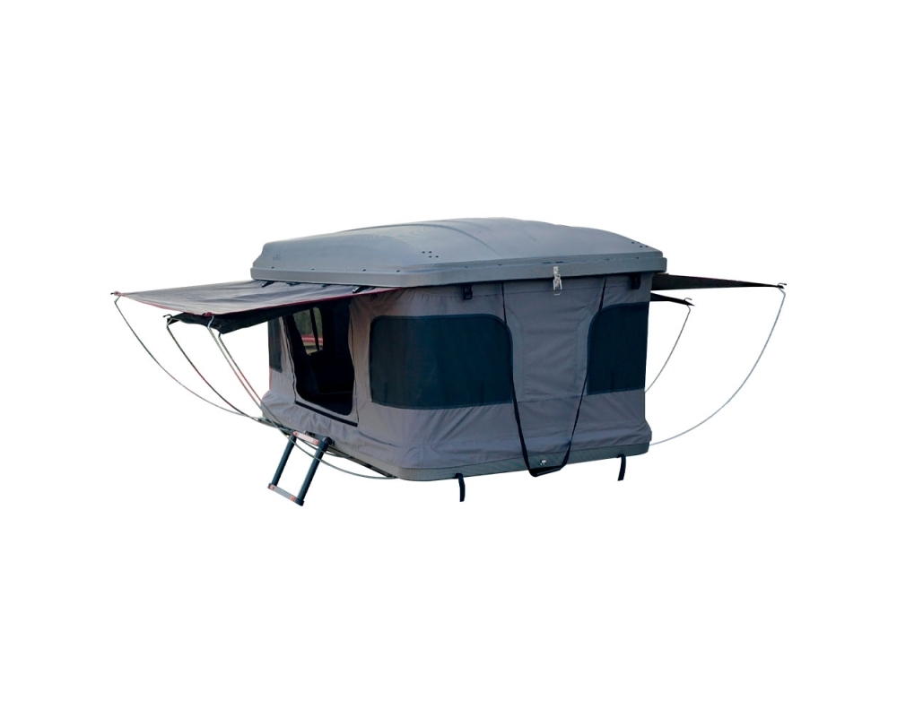 Esta tienda de techo cuenta con dos accesos laterales (al pie de los accesos existen soportes para fijar la escalera de aluminio) y una ventana panorámica con mosquitera en cada una de las esquinas de la tienda, proporcionando más iluminación y facilitando la ventilación, además de disfrutar de una vista casi de 360o.