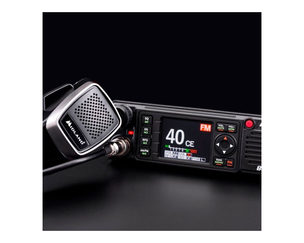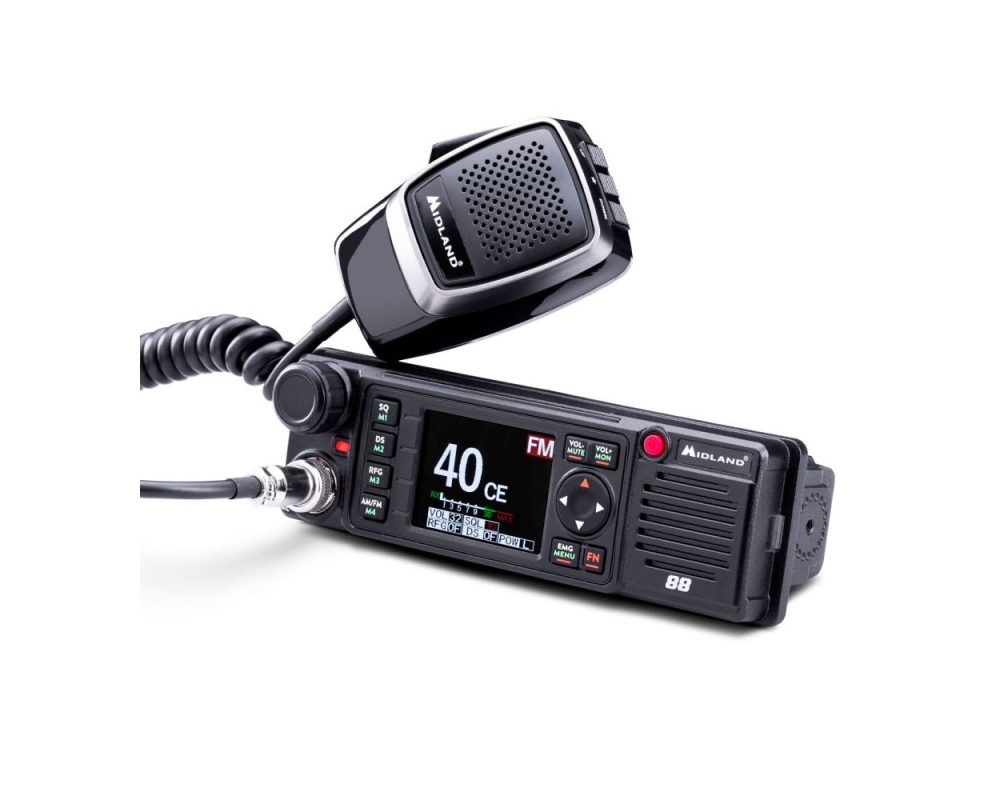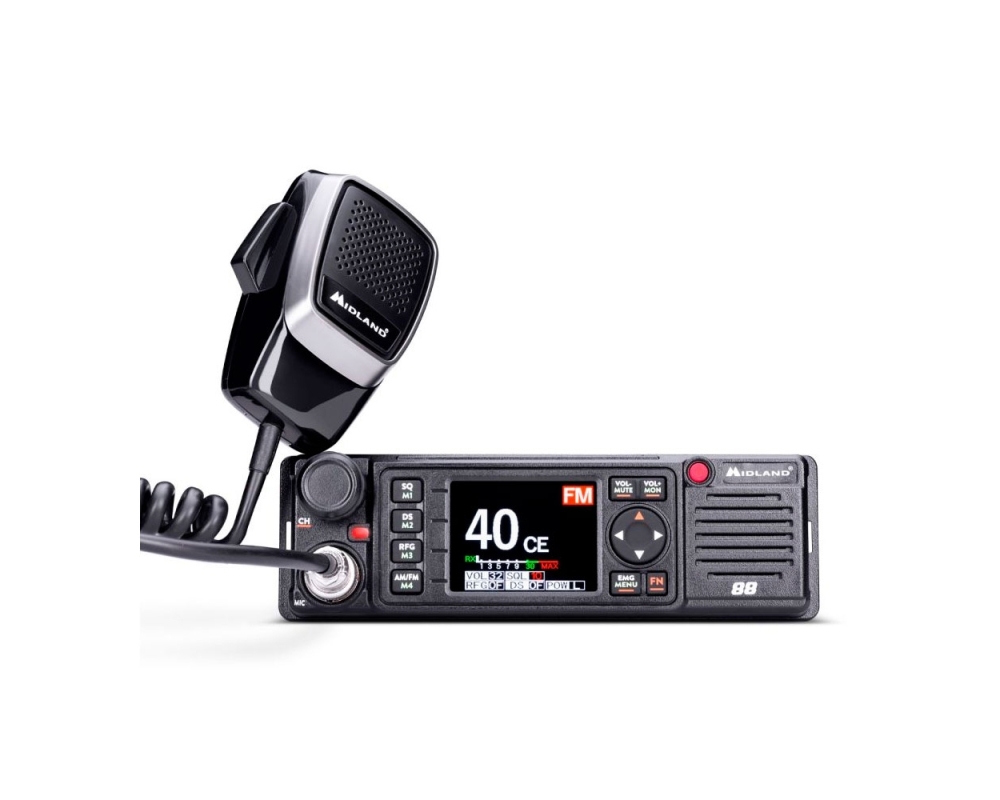 M88 es una radio CB versátil, apta para cualquier superficie y compartimento DIN, con alimentación de 12/24 V y equipada con protección contra desajuste del circuito de antena. Con todos los accesorios incluidos, puedes colgarla en el parabrisas o instalarla en el salpicadero. M88 se enciende automáticamente y con los botones Arriba/Abajo/Canal prioritario directamente en el micrófono, puedes cambiar de canal en un abrir y cerrar de ojos. M88 es multibanda, tanto FM/AM, por lo tanto apta para comunicarse incluso más allá de las fronteras nacionales, adaptándose a las frecuencias europeas. El chasis de aluminio hace que el dispositivo sea fuerte y resistente y alberga una gran pantalla TFT a color con indicaciones claramente visibles. ¿Y las funciones? Muchas y completas: PA, almacenamiento de 4 canales, Dual Watch (para tener siempre dos canales bajo control ), Roger Beep (una señal acústica para cerrar la comunicación), el squelch digital en múltiples niveles y filtros para la eliminación del ruido de fondo (Noise Blanker e HIC). En la versión export, Midland 88 tiene: - Potencia 8W AM - 15W FM - 400 canales CB - Banda Amateur 340 canales (28.000 - 29.695 MHz) - Modo VFO (24.715 / 30.105 Mhz) - Activación CTCSS - DCS