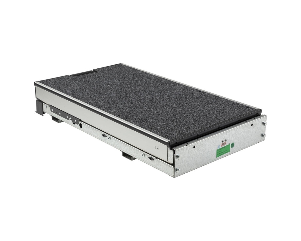 Roller Floor es un nuevo producto fantástico. El Roller Floor se sitúa a sólo 140 mm del suelo del vehículo, lo que permite un montaje más bajo y un acceso más fácil a elementos como frigoríficos o cajas de herramientas. El Roller maximiza el espacio de almacenamiento con una bandeja deslizante incorporada. Cuando no aloja un frigorífico, el Roller Floor tiene una parte superior plana que resulta mucho más cómoda para colocar otros objetos que una bandeja deslizante de acero tradicional para frigoríficos. ¿Ha intentado alguna vez colocar la compra encima de una bandeja de frigorífico tradicional?