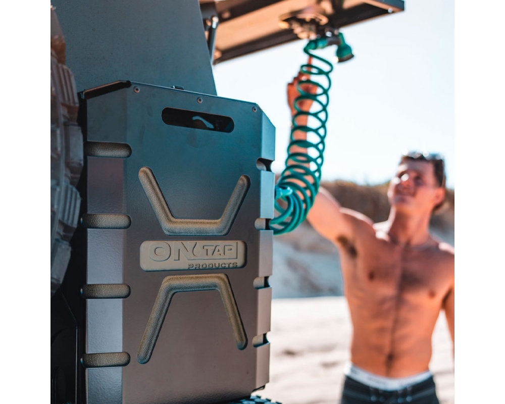 Funcionamiento a 12V con toma de mechero y 22 litros de capacidad que permiten duchas de 5 minutos. El grifo tiene una manguera de 4m y 7 posiciones de spray.