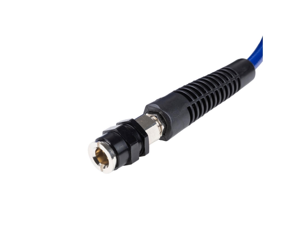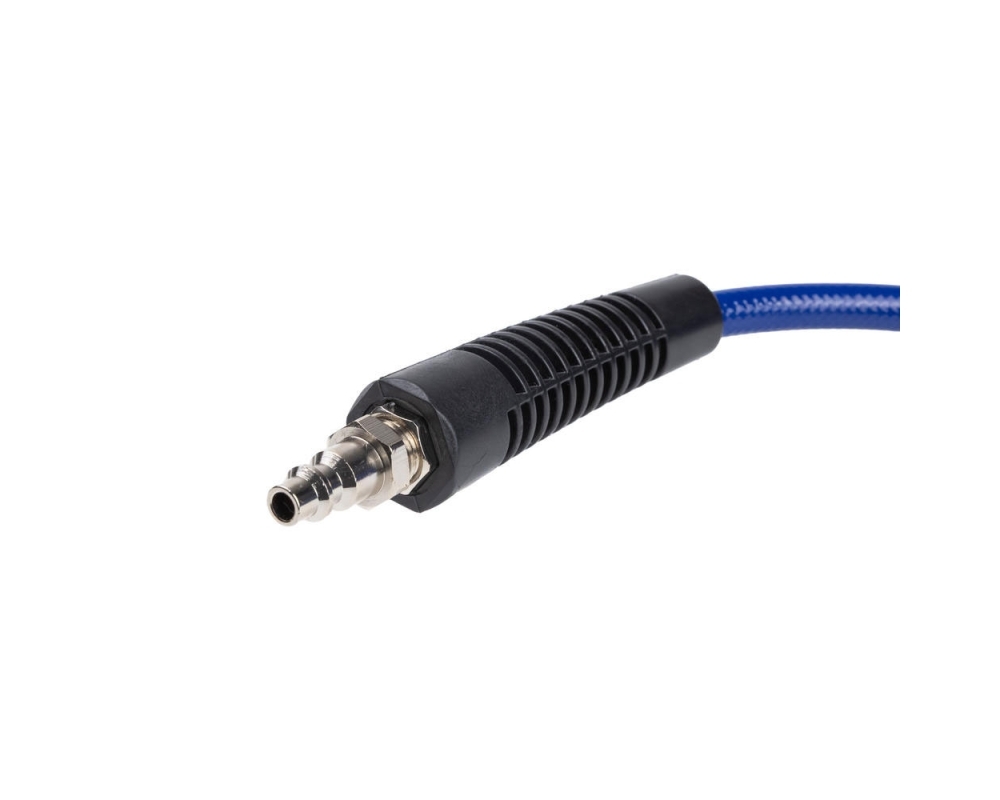 Su longitud de 8 metros permite llegar cómodamente a cualquier rueda o accesorio neumático sin necesidad de mover el compresor constantemente. Diseñada para soportar altas presiones, esta manguera garantiza un flujo de aire constante y seguro, incluso en condiciones extremas.