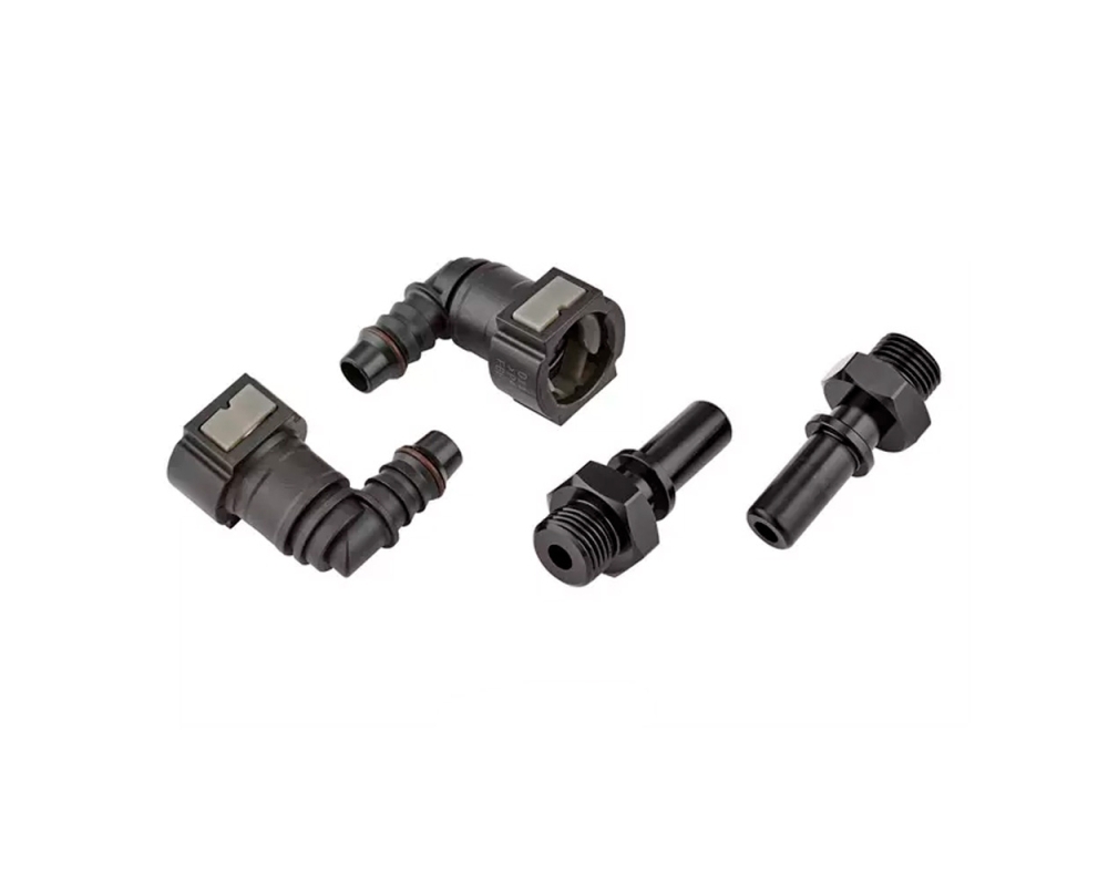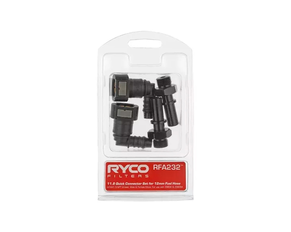 Set de conectores rápidos RFA232 RYCO diseñado para facilitar la instalación de separadores de agua y combustible con rosca M16 x 1.5, compatible con mangueras de hasta 12 mm y sistemas de filtración 4x4.