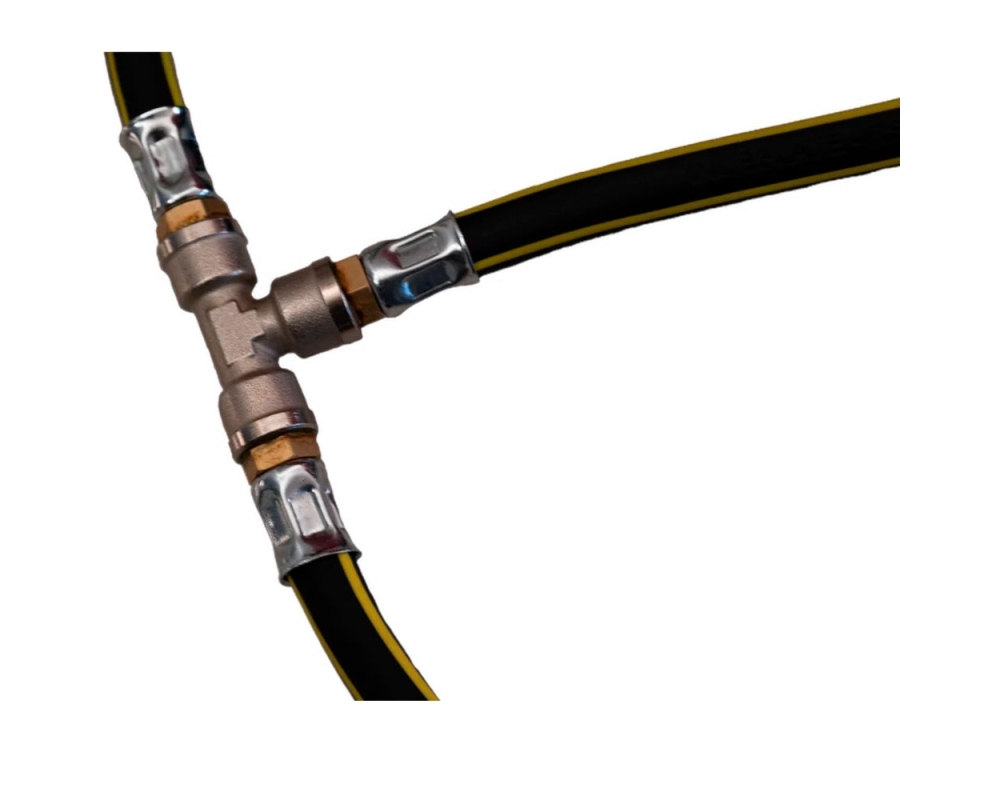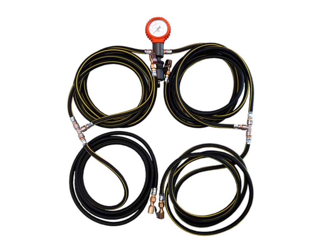 Una válvula Schrader en un extremo de la válvula de descarga (la misma que la de los neumáticos) permite conectarla fácilmente a un compresor de aire para inflar los neumáticos de forma simultánea.