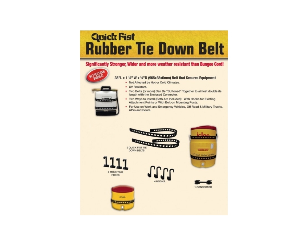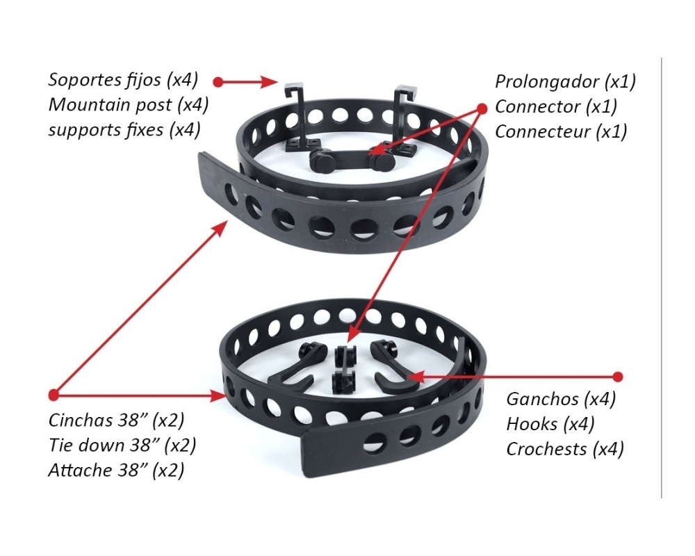 2 cinchas 38" + 4 soportes fijos + 4 ganchos + 1 prolongador - Goma de amarre.