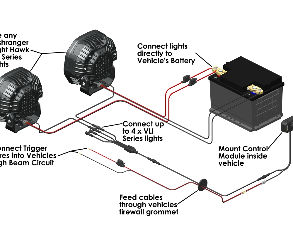 Cada faro se alimenta directamente de la batería, en lugar de a través de un relé, lo que significa que no hay restricciones de energía para el sistema de cableado, lo cual es una limitación común en las instalaciones tradicionales basadas en relés. Se pueden controlar hasta 4 faros LED Night Hawk VLI de la serie Bushranger mediante un sistema de cableado y se puede usar cualquier combinación de modelos / tamaños.
