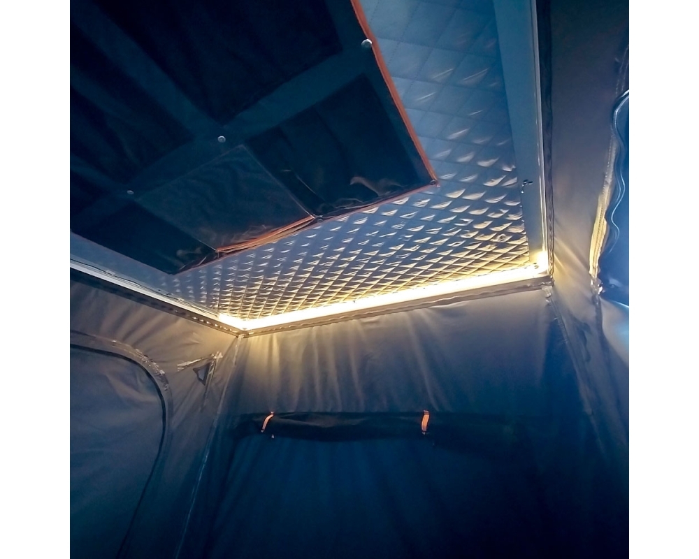 Además, se incluye una tira de led en el interior, múltiples bolsillos para guardar objetos tanto en laterales como en techo, zapateros extraíbles con bordón y cierre de seguridad.