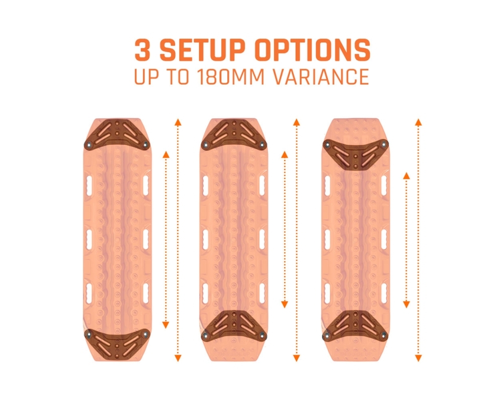 O suporte de rack plano universal MAXTRAX pode conectar com segurança até 4 placas de resgate MAXTRAX MKII, 4 placas de resgate MAXTRAX LITE (pinos de montagem MK2/LITE), 4 placas de resgate MAXTRAX XTREME (pinos de montagem Xtreme) ou um par de cada (pinos de montagem híbridos).