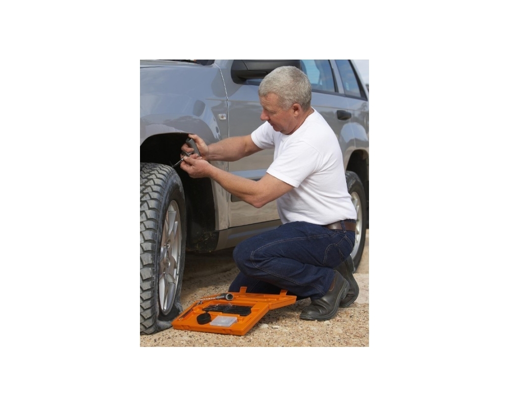 Protegido em uma caixa compacta, mas facilmente visível, está o kit de reparo de pneus Speedy Seal Série II, que inclui todos os componentes necessários para reparar pneus radiais ou transversais sem câmara sem remover o pneu do aro ou desmontá-lo do veículo. Um medidor de pneu tipo lápis de bico duplo regula a pressão interna rapidamente, enquanto o encaixe de aço atualizado permite um ajuste rápido de nível.