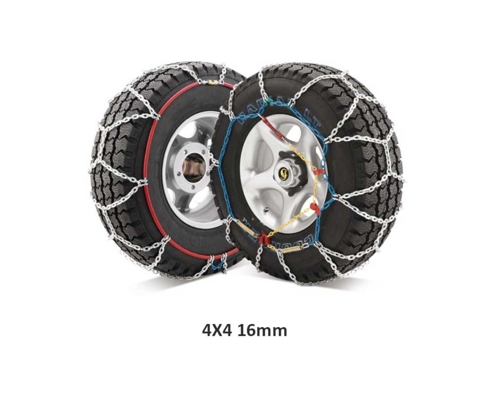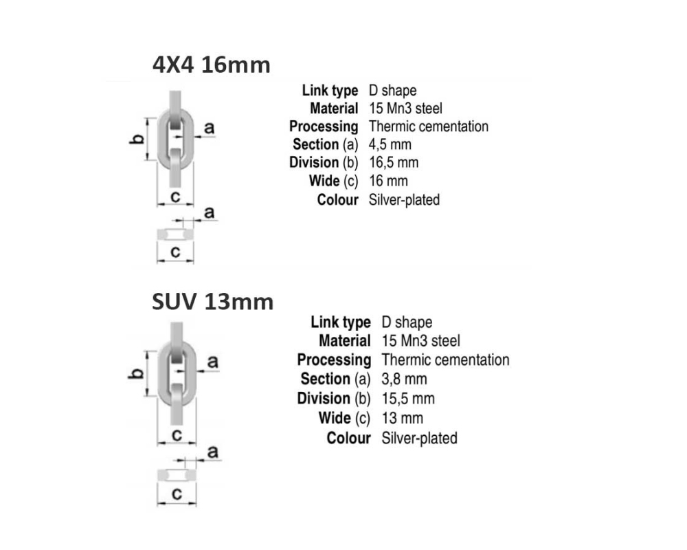 Projetado para SUVs e 4x4 com espaço suficiente para instalar correntes de aço desta espessura. Espessura do aço 4,5 milímetros.