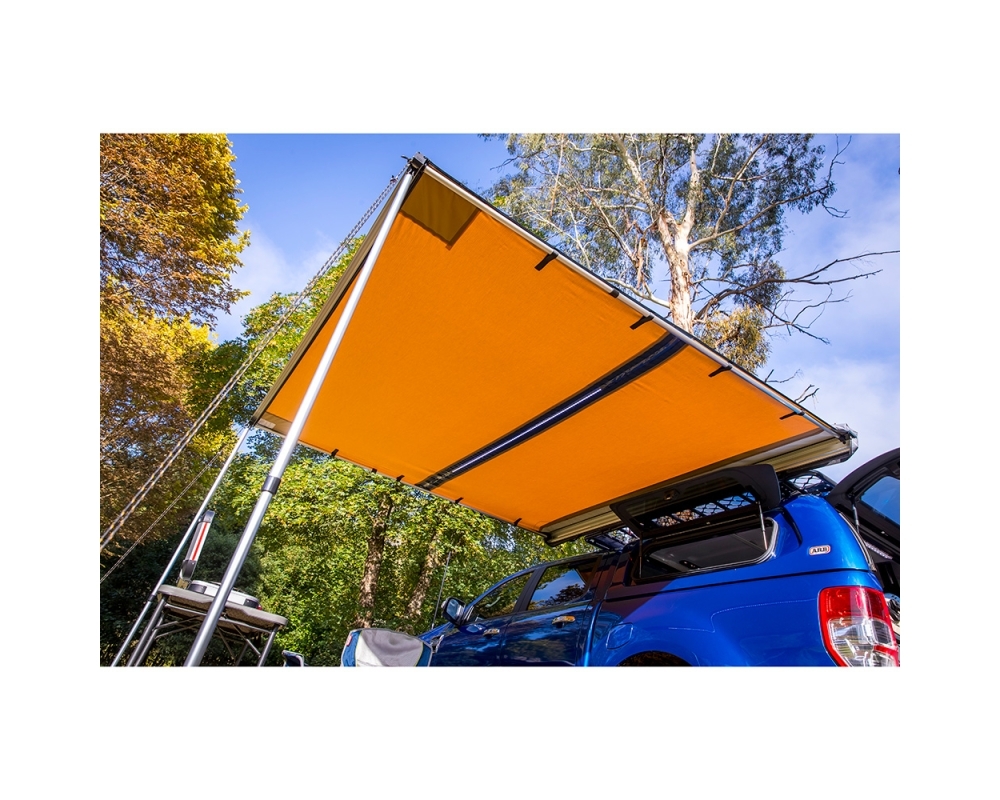 Toldo de enrolar com cobertura em PVC e fecho de correr para instalar na maioria dos veículos, na lateral da maioria das barras de tejadilho e racks de tejadilho. Eles foram projetados especificamente para as duras condições do outback australiano.