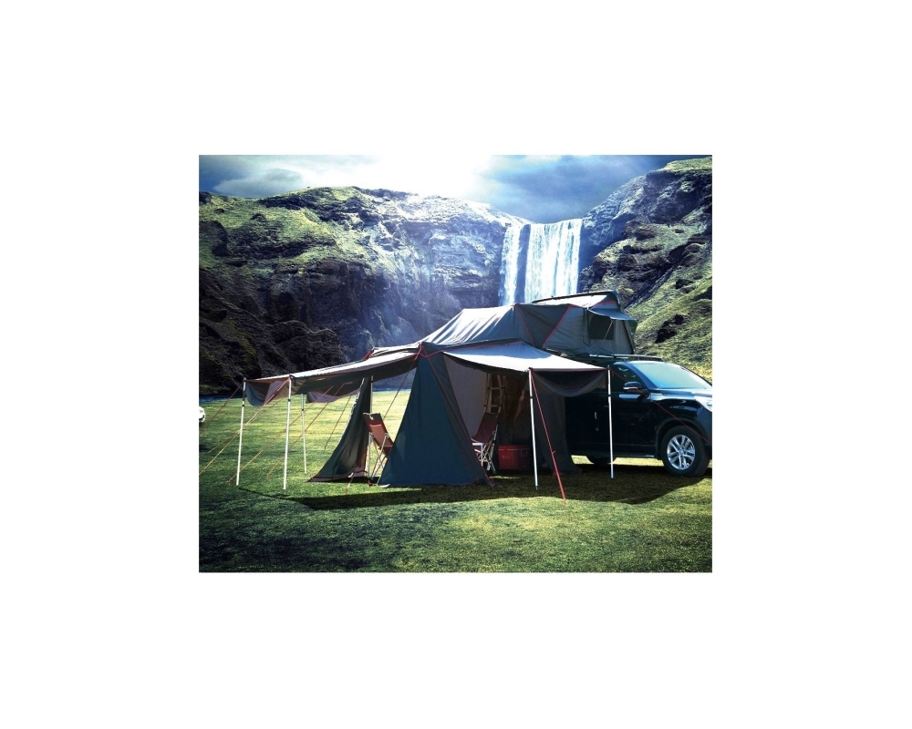 O recinto completa a habitabilidade da cor do telhado Bullface "RABAT". Esta extensão proporciona uma superfície extra para privacidade e pernoites quando temos a tenda montada no telhado. O trailer possui portas com zíper que podem virar um toldo se as apoiarmos com mastros.