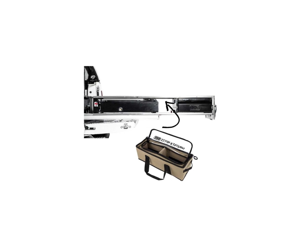 Este prático saco cabe perfeitamente no espaço da Slide Kitchen, entre a cozinha e a gaveta. Mede 45x15x15 (cm) e é feito de PVC resistente à água. A tampa é transparente e fecha com zíper, mantendo seus utensílios seguros quando a cozinha está fechada e de muito fácil acesso ao abrir.
