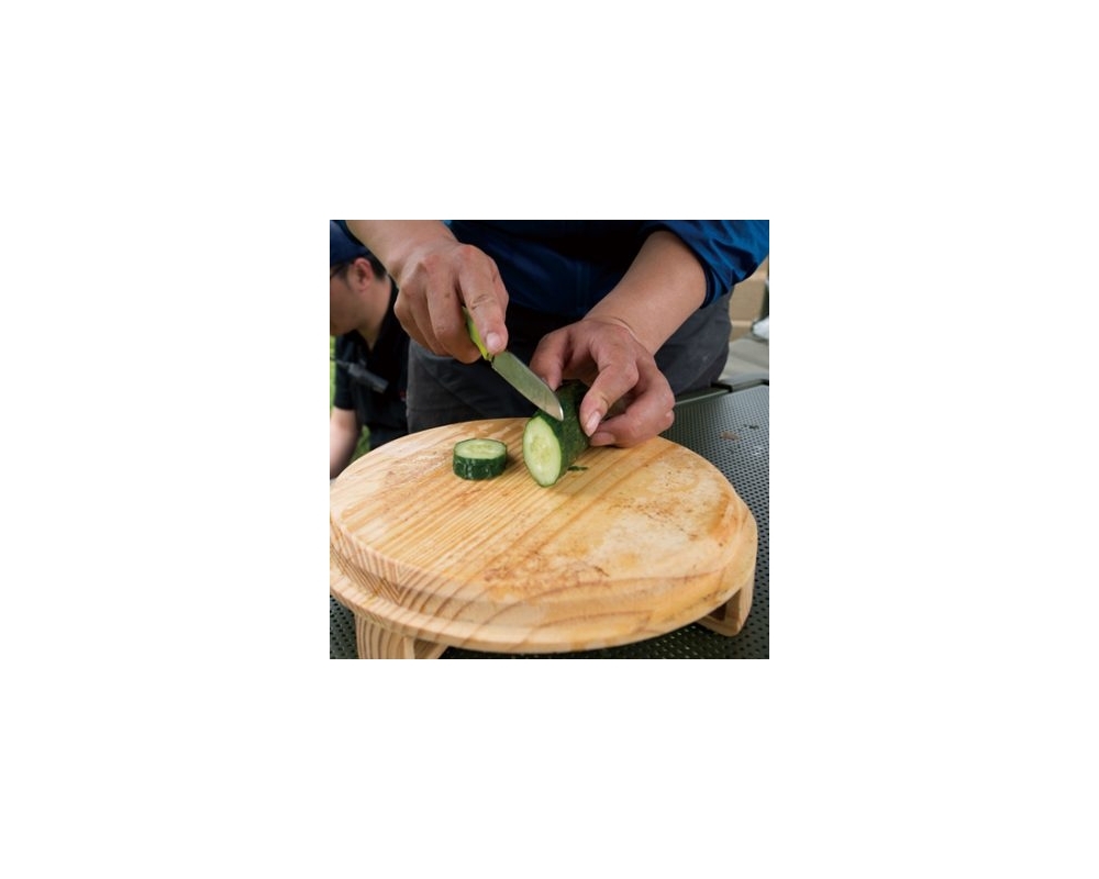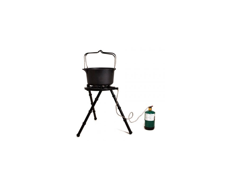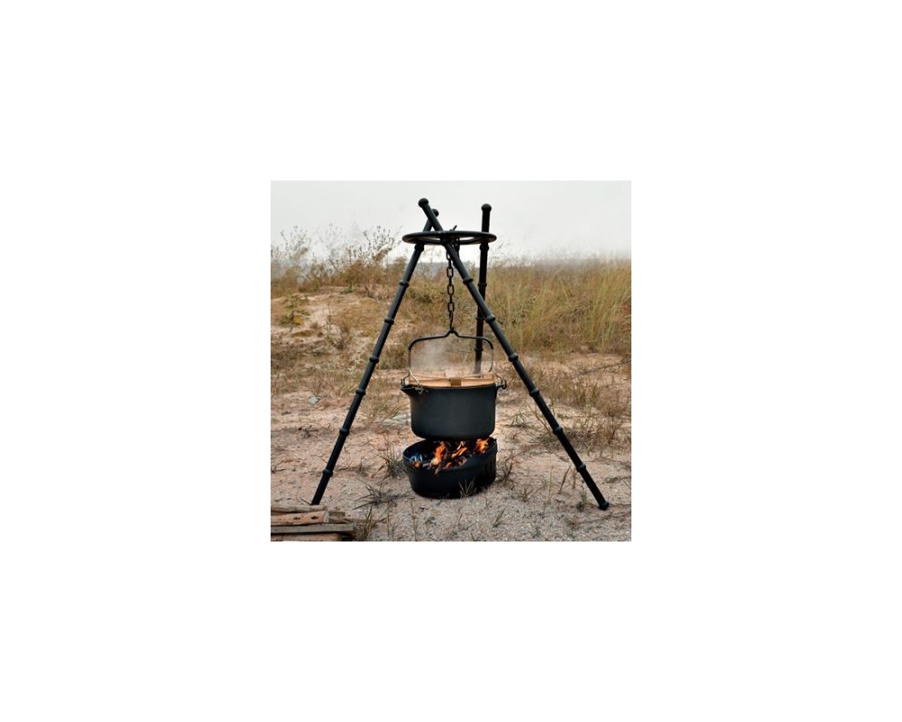 Inclui uma tábua de madeira, que funciona como tampa de panela e, ao mesmo tempo, pode ser usada como tábua de cortar. Pode ser utilizado com lenha, gás ou carvão. A corrente permite pendurar a panela sobre o fogo.