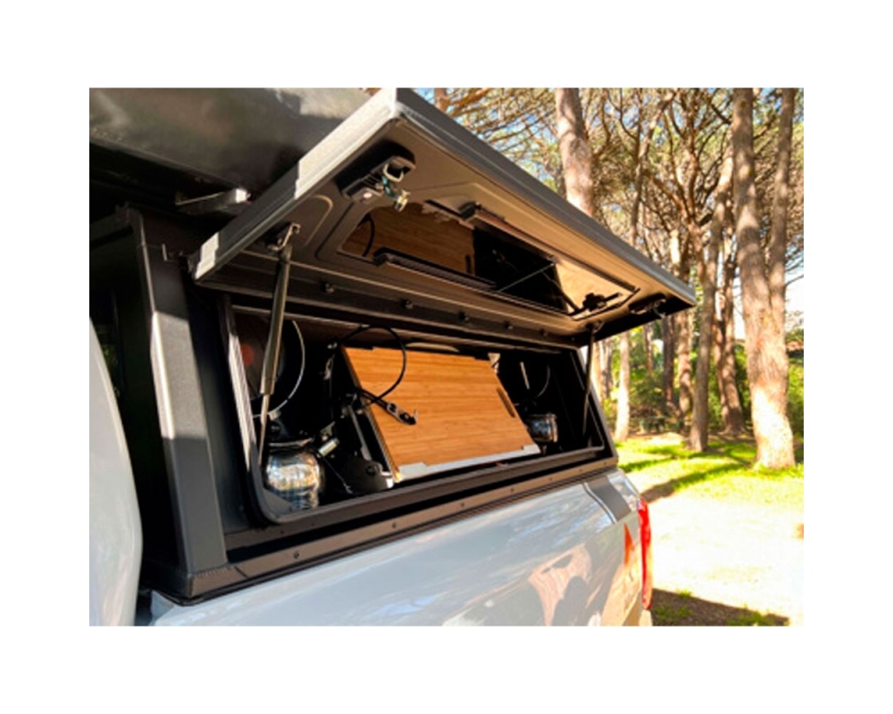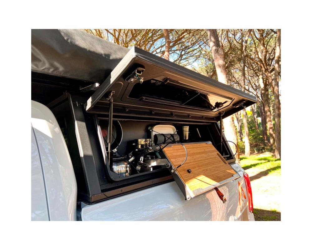 Alu-Cab | Compartimento lateral de 1250mm + mesa e utensílios, é a solução definitiva para criar uma cozinha totalmente funcional dentro da sua copa. Projetado para maximizar o espaço e oferecer comodidade absoluta, este sistema integra arrumação, mesa, utensílios e superfícies de trabalho num único módulo compacto e robusto.