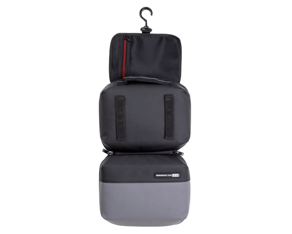 Possui vários bolsos internos com elásticos integrados que mantêm os objetos seguros durante o transporte, além de dois porta-escovas específicos. Seu espelho removível inclui bolso traseiro plano e permite maior conforto no uso diário. O gancho giratório de 360° facilita pendurar e acessar facilmente o conteúdo em qualquer ambiente.