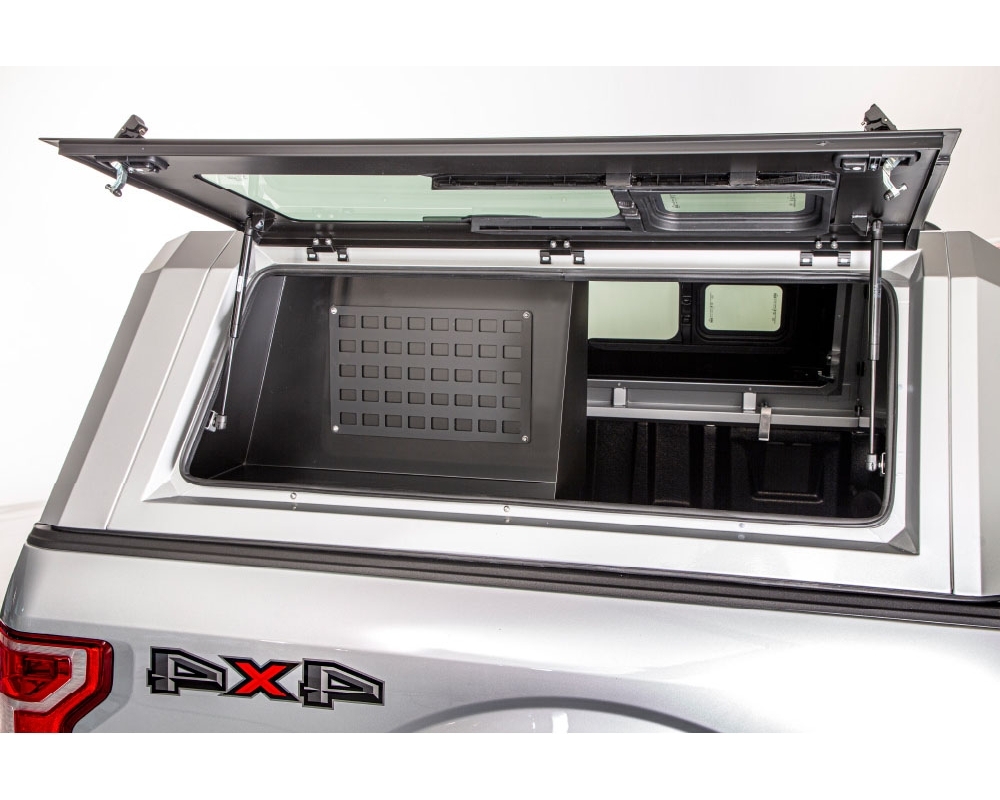 Espaço de armazenamento conectado à caixa de coleta. Permite continuar a ter acesso pelo portão lateral, e ao mesmo tempo, ter acesso a uma zona de arrumos. Possui painel Molle para melhor organização