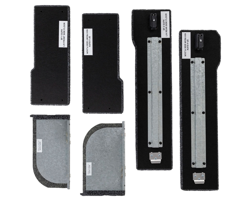 Cada kit de painel lateral contém pisos laterais esquerdo e direito. As abas de travamento em aço inoxidável localizam e retêm uma extremidade da seção removível do painel, enquanto a outra extremidade é fixada com uma trava de apertar para fechar fácil de usar. Uma única alavanca desengata a trava para remover o painel. A combinação de abas de aço inoxidável e uma trava simples e direta resulta em uma área de armazenamento muito fácil de usar e segura.