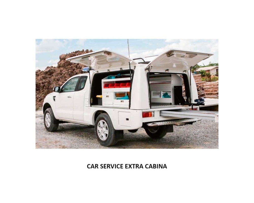 O módulo integral CAR SERVICE é fabricado integralmente em fibra de vidro e instala-se diretamente no chassis do veículo, substituindo a caixa original. Incorpora janelas e portão traseiro basculantes que permitem aceder facilmente ao interior para carregar ou retirar mercadorias, além de permitir a instalação de mobiliário interior à medida para transporte de ferramentas, peças de reposição, acessórios ou equipamentos de trabalho.