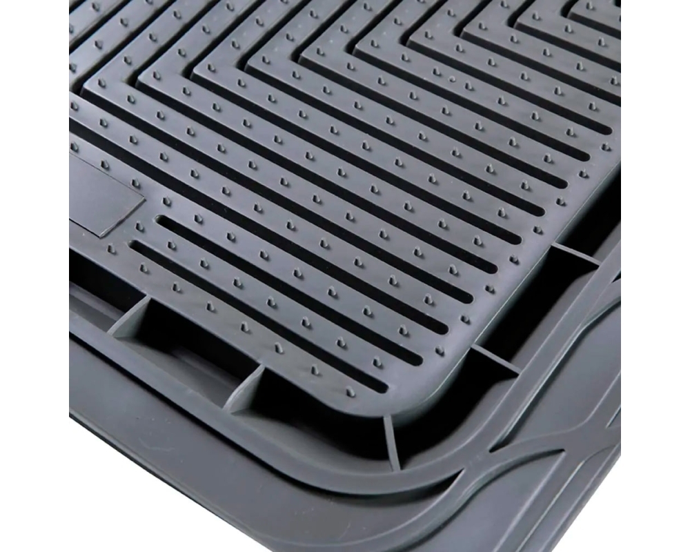 Feito de borracha sólida, que ajuda a manter a integridade e a forma. Muito fácil de limpar com água pressurizada. O contorno do tapete é formado por uma saliência que é responsável por guardar no interior os restos do calçado. A parte inferior do tapete possui pequenas pontas para evitar que o tapete deslize. De tamanho generoso, eles também podem ser cortados para um ajuste personalizado.