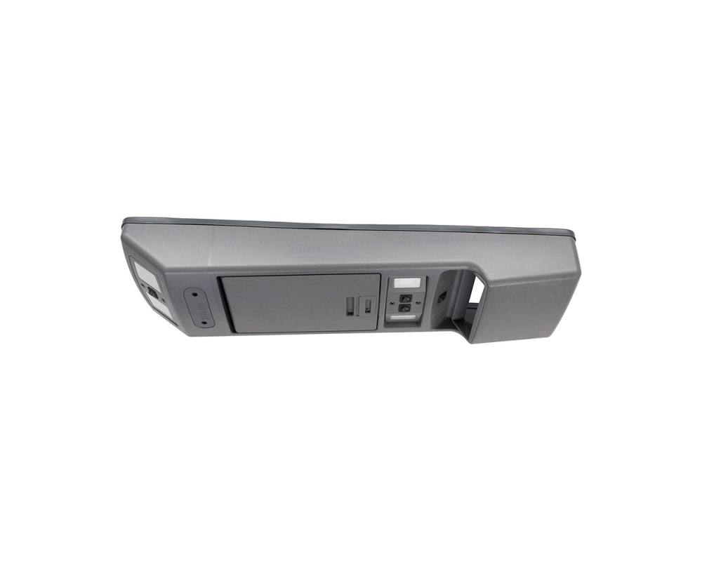 Os consoles do teto são feitos de plástico ABS e integram-se perfeitamente ao interior do veículo. O produto inclui luzes LED e um baú desdobrável para guardar objetos, além de espaço para transmissor formato DIN.