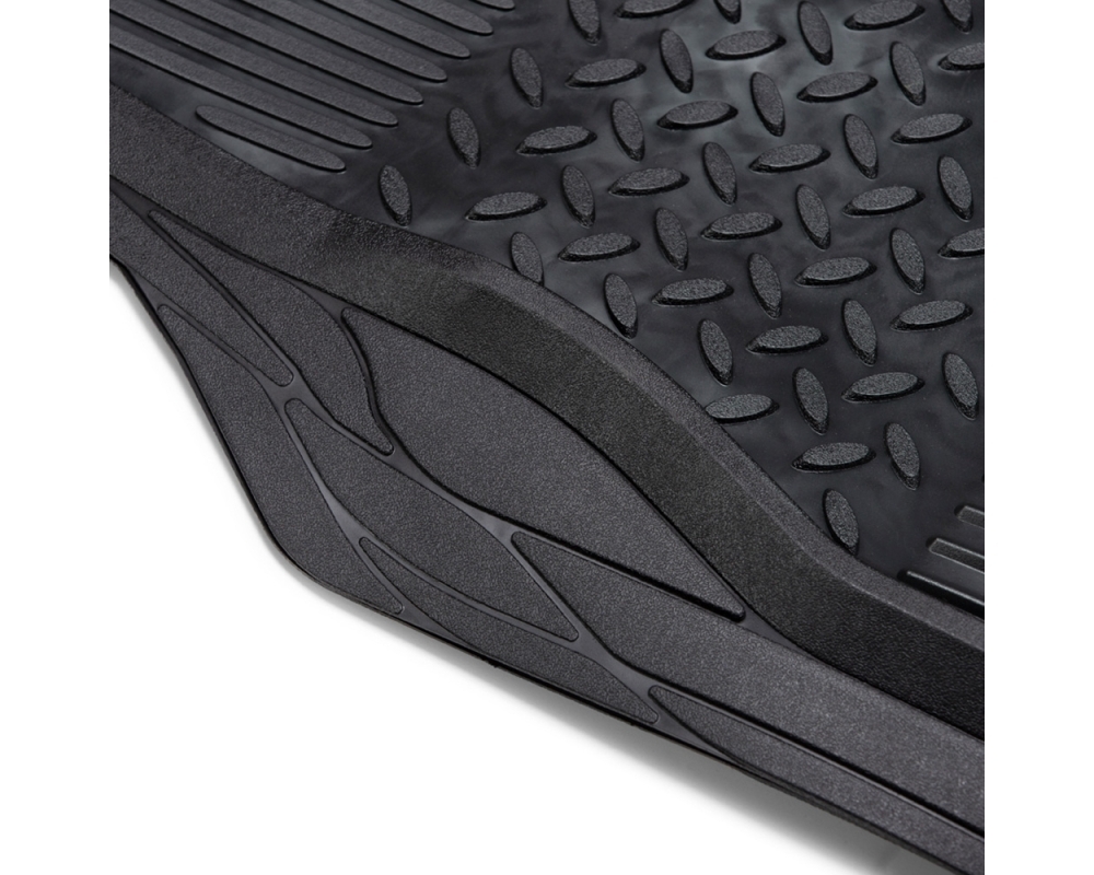 Feito de borracha sólida, que ajuda a manter a integridade e a forma. Muito fácil de limpar com água pressurizada. O contorno do tapete é formado por uma saliência que é responsável por guardar no interior os restos do calçado. A parte inferior do tapete possui pequenas pontas para evitar que o tapete deslize. De tamanho generoso, eles também podem ser cortados para um ajuste personalizado.