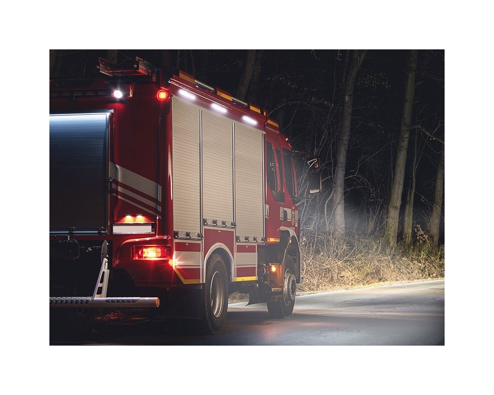 Farol especialmente projetado para caminhões de bombeiros e veículos de emergência. É robusto e totalmente à prova d'água. O seu feixe de luz disperso ilumina perfeitamente as áreas de trabalho ao redor do veículo. Pode ser instalado horizontalmente em qualquer elemento plano da carroceria do veículo.