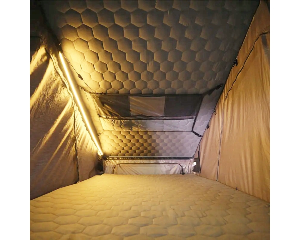O tecido externo é confeccionado em Polioxford 210D, um dos tecidos mais resistentes e duráveis do mercado, garantindo maior proteção contra intempéries. Para as noites mais frias, foi adicionada uma entrada lateral que permite conectar um sistema de aquecimento estacionário do veículo.