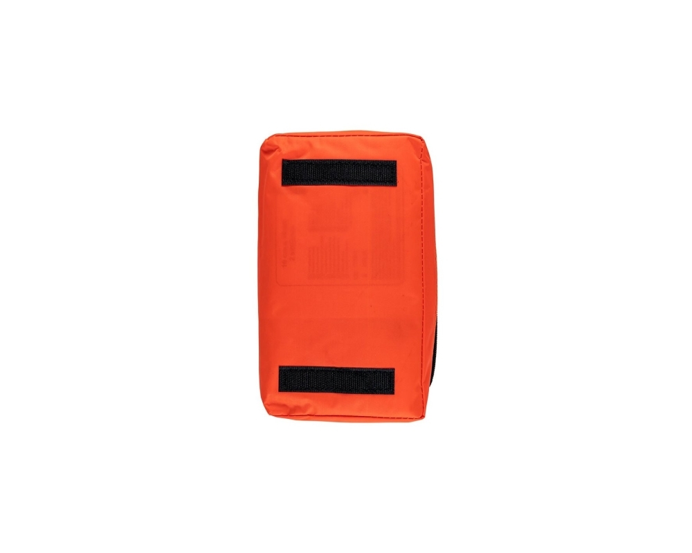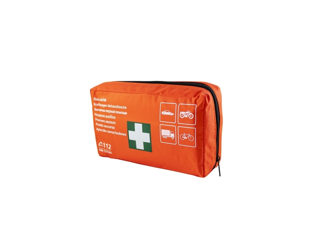 Pequeno e prático kit de primeiros socorros, ideal para o carro e fácil de transportar, apresentado em bolsa com fecho de correr e velcro nas costas.