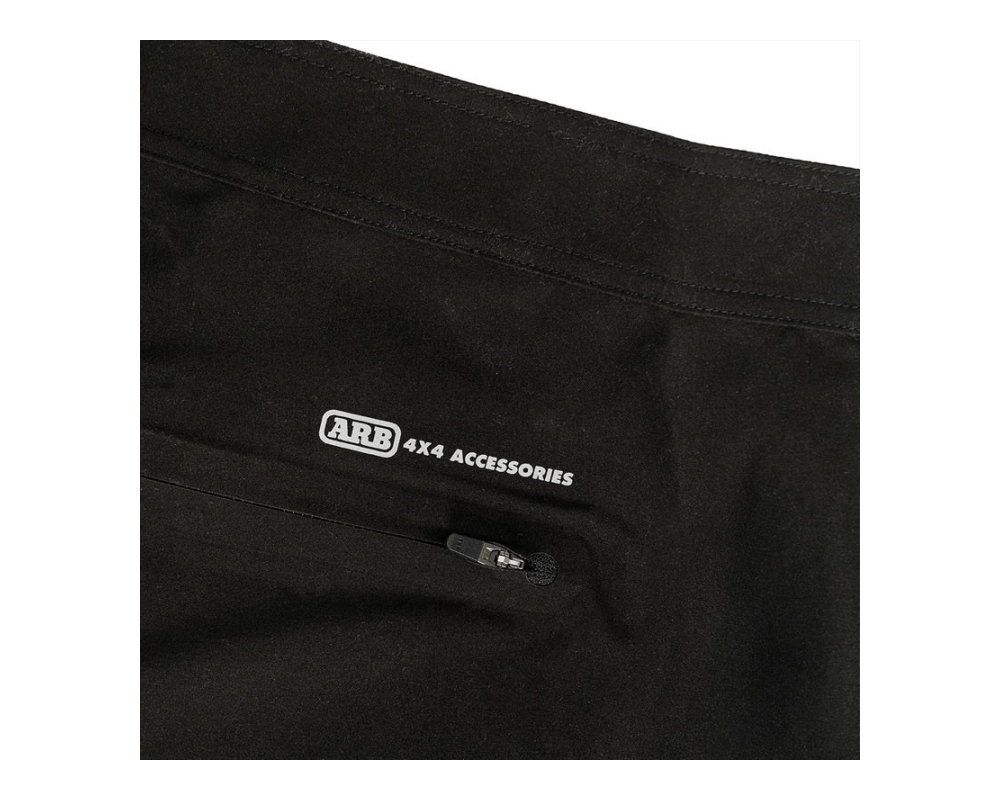 O bolso traseiro tem um zíper para manter itens valiosos seguros e protegidos e há a marca ARB preta em uma perna e nosso slogan Adventure Awaits na outra perna.