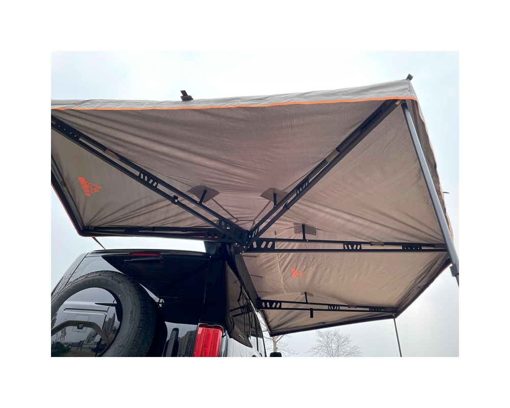 Os toldos 270 têm a particularidade de abrir em forma de leque (ou asa de morcego) até 270° e estão disponíveis com duas distribuições de espaço útil e com dois tipos de braço, simples ou reforçado. Você também pode escolher entre dois tamanhos de toldo e todos incluem mastros. Os toldos Bullface 270 são confeccionados com tecido Oxford 600D impermeável e resistente aos raios ultravioleta com fator de +50.