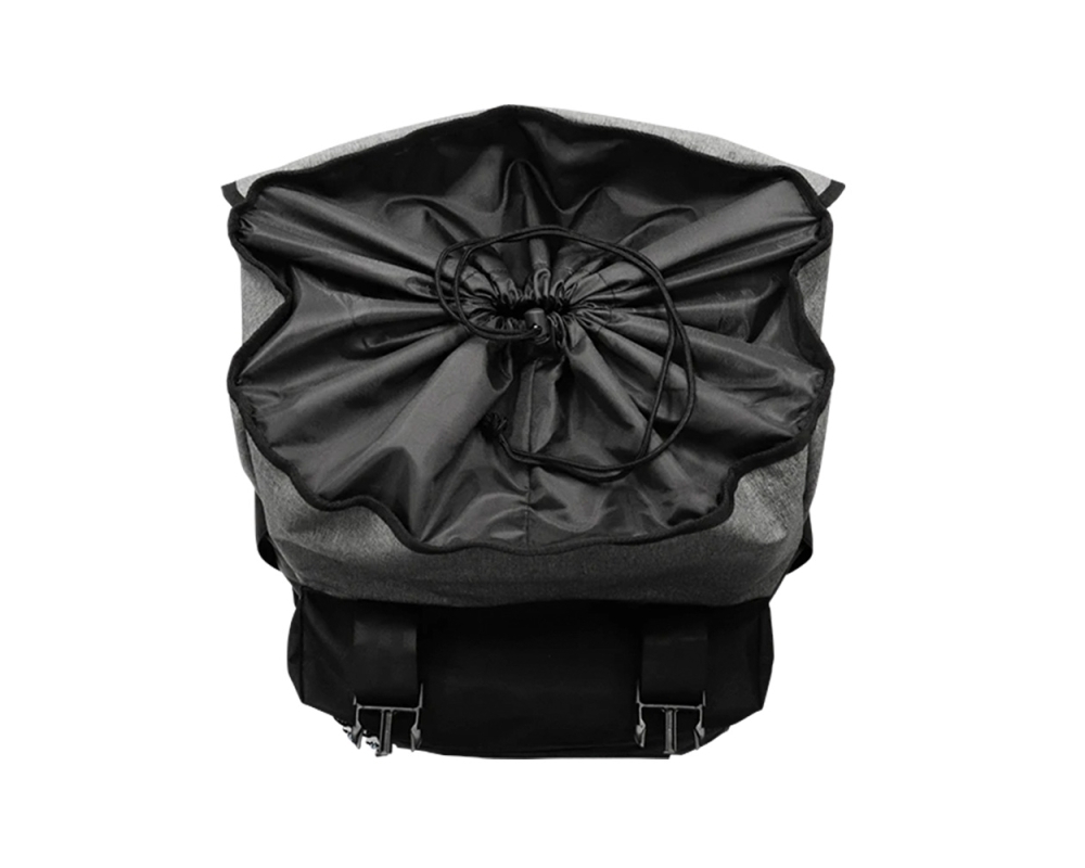 • O bolso frontal possui zíper de borracha com controle deslizante duplo e orifício de drenagem