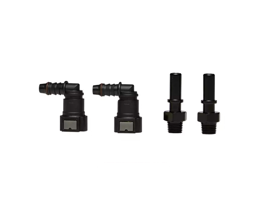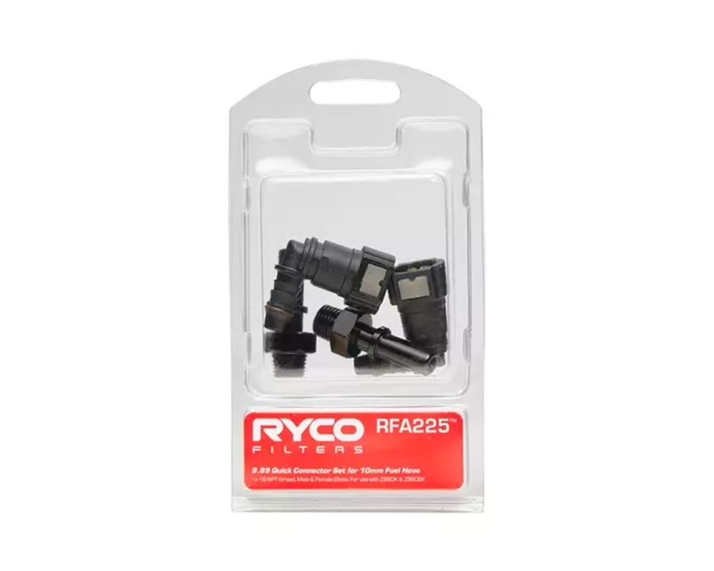 Conjunto de conectores rápidos RFA225 RYCO para mangueiras de combustível de 10 mm, projetados para facilitar a instalação de separadores de combustível e água com rosca 1/4" NPT.