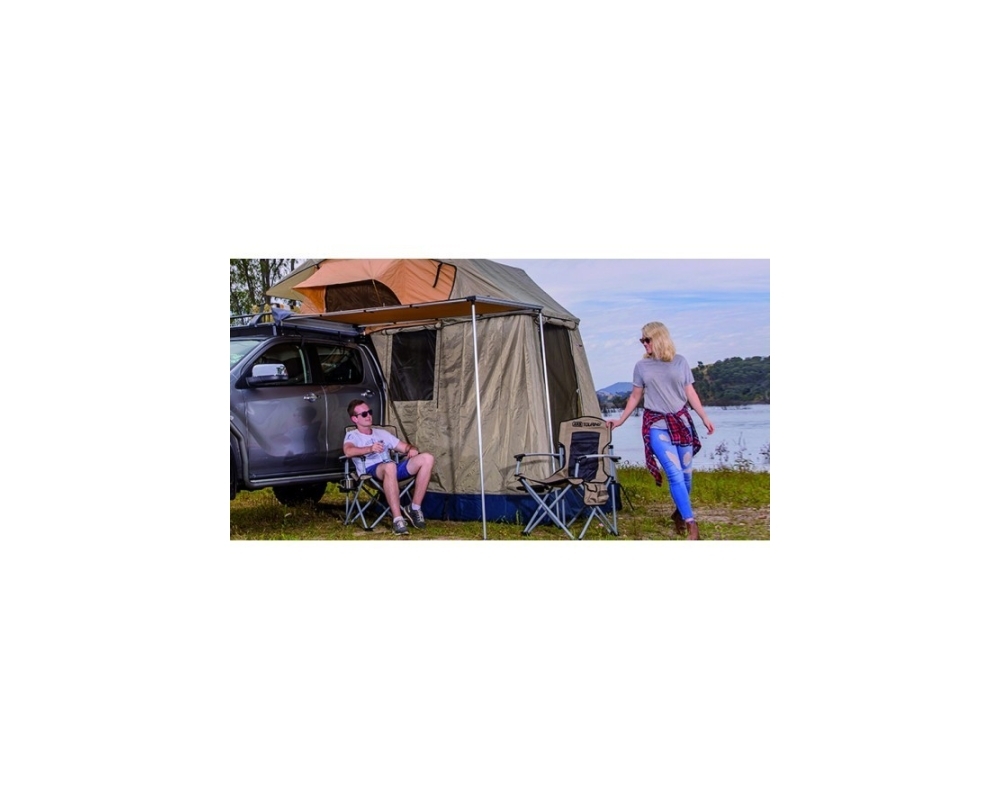 O trailer se encaixa perfeitamente na saliência da barraca quando desdobrado. Abrange uma área de 2,00 x 2,00 metros à volta da escada que dá acesso ao interior da loja. É equipado com porta com zíper e mosquiteiro, além de duas janelas nas laterais.
